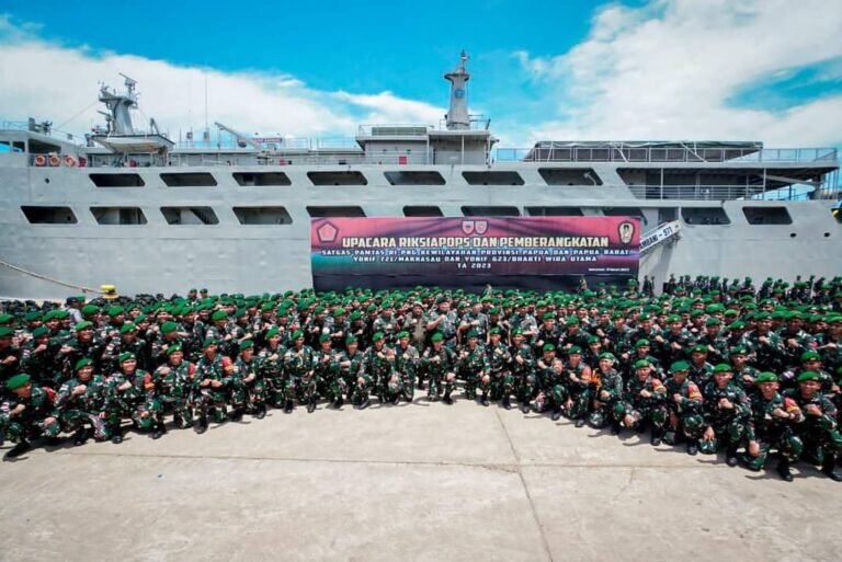 Panglima TNI Laksamana TNI H. Yudo Margono, SE, MM, CSFA bersama Ketua Dharma Pertiwi Ibu Vero Yudo Margono, didampingi Pangdam XIV/Hasanuddin Mayjen TNI Totok Imam Santoso, SIP, S.Sos, M.Tr.(Han), Pangdam VI/Mulawarman Mayjen TNI Tri Budi Utomo dan Pejabat Utama (PJU) Mabes TNI beserta para Forkopimda Provinsi Sulsel serta Forkopimda Kota Makassar melepas keberangkatan Satuan Tugas (Satgas) Pengamanan Perbatasan (Pamtas) RI-PNG Yonif 721/Makassau dan Yonif 623/Bhakti Wira Utama, ke wilayah Provinsi Papua dan Papua Barat, bertempat di Pelabuhan Soekarno–Hatta Makassar, Jumat (31/03/2023).