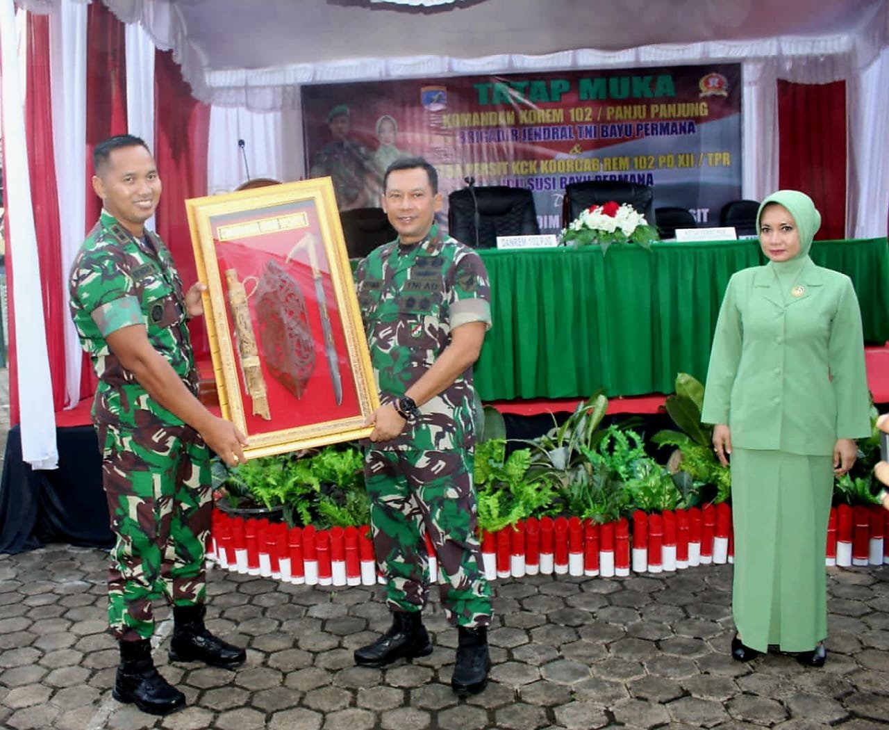 Komandan Korem (Danrem) 102/Pjg Brigjen TNI Bayu Permana yang didampingi Ketua Persit KCK Koorcab Rem 102 PD XII Tanjungpura Ny. Susi Sugandi Bayu Permana, beserta Kasi Intel Kasrem 102/Pjg, Letkol Arm Heri Pujiyanto, S.Sos dan istri, serta Kasi Pers Kasrem 102/Pjg, Kolonel Caj Dodi Mulyadi, SE.MM bersama istri melaksanakan kunjungan kerja (Kunker) perdana di wilayah Kodim 1012/Buntok, bertempat di Makodim 1012/Buntok Jalan Pelita Raya Kabupaten Barito Selatan, Provinsi Kalimantan Tengah, Rabu (05/04/2023).