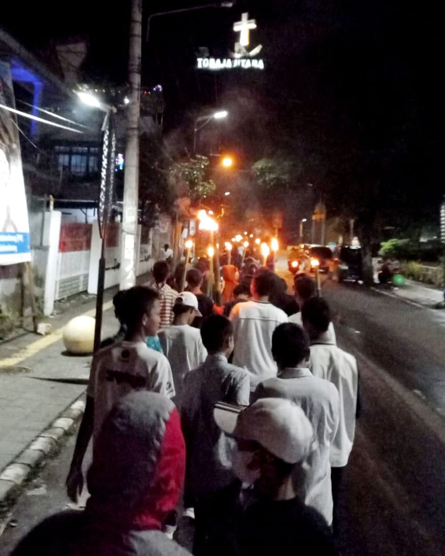 Rombongan pemuda yang berbaris rapih berjalan dengan penerangan obor sambil melantunkan syahdu kidung-kidung paskah, menapaki ratusan anak tangga ke Bukit Singki'. Walau sempat diguyur hujan saat di pendakian, hal ini tidak menyurutkan semangat ratusan pemuda PPGT untuk terus berjalan mendaki Bukit Singki.