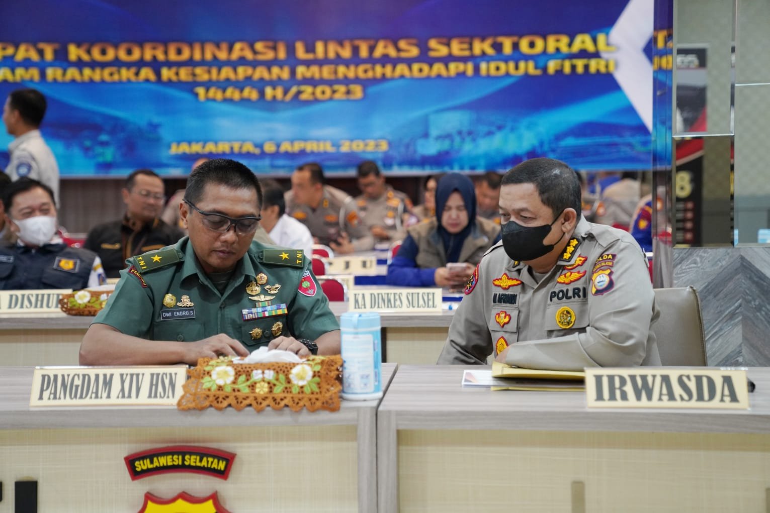 Irdam XIV/Hasanuddin Brigjen TNI Dwi Endrosasongko, S.Sos mewakili Pangdam XIV/Hasanuddin, menghadiri Rapat Koordinasi (Rakor) Lintas Sektoral dalam rangka Kesiapan Menghadapi Idul Fitri 1444 H/2023 secara virtual, bertempat di Lobby Lontang Addupangeng Bharadaksa Mapolda Sulsel, Kota Makassar.), Kamis (06/04/2023).