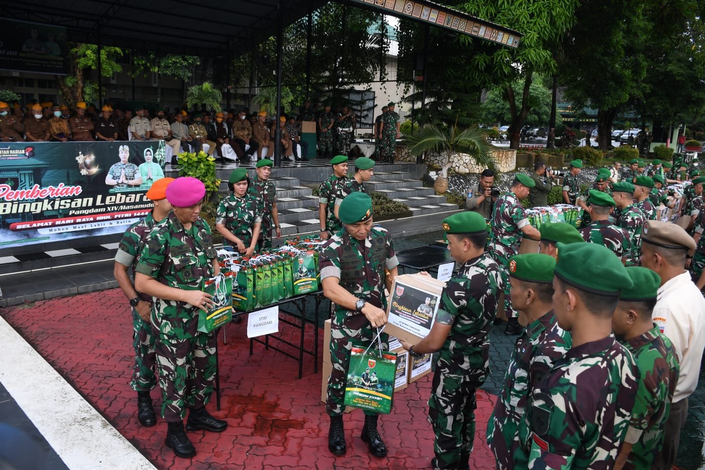 Terkait hal tersebut, Pangdam XIV/Hasanuddin Mayjen TNI Dr. Totok Imam Santoso, SIP, S.Sos, M.Tr.(Han) pada kesempatan ini menyerahkan ratusan bingkisan lebaran kepada personel Staf Umum Kodam XIV/Hasanuddin, bertempat di Lapangan M. Yusuf Makodam, Kota Makassar, Selasa (11/04/2023).