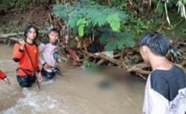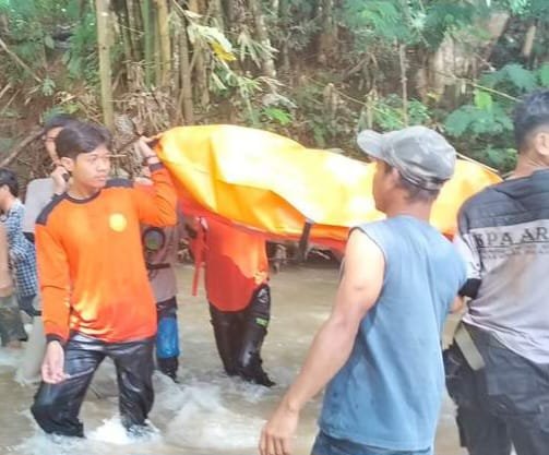 Korban ditemukan tersangkut pada dahan pohon di sungai. Korban kemudian dievakuasi ke puskesmas.