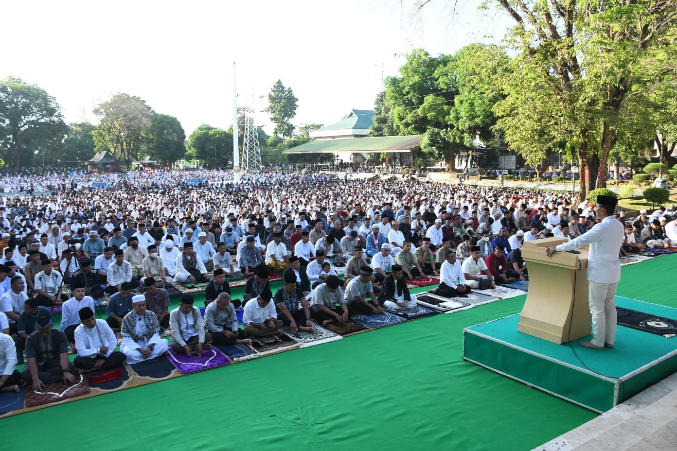 “Tentunya kita semua berharap ke depan dengan mengevaluasi pelaksanaan ibadah puasa kita, hari ini Sholat Idul Fitri, ke depan kita harus lebih baik lagi iman dan taqwa kita, meningkatkan pemahaman kita tentang ajaran agama Islam, meningkatkan rasa toleransi beragama, dan rasa cinta kita kepada NKRI yang kita cintai bersama," ungkapnya.