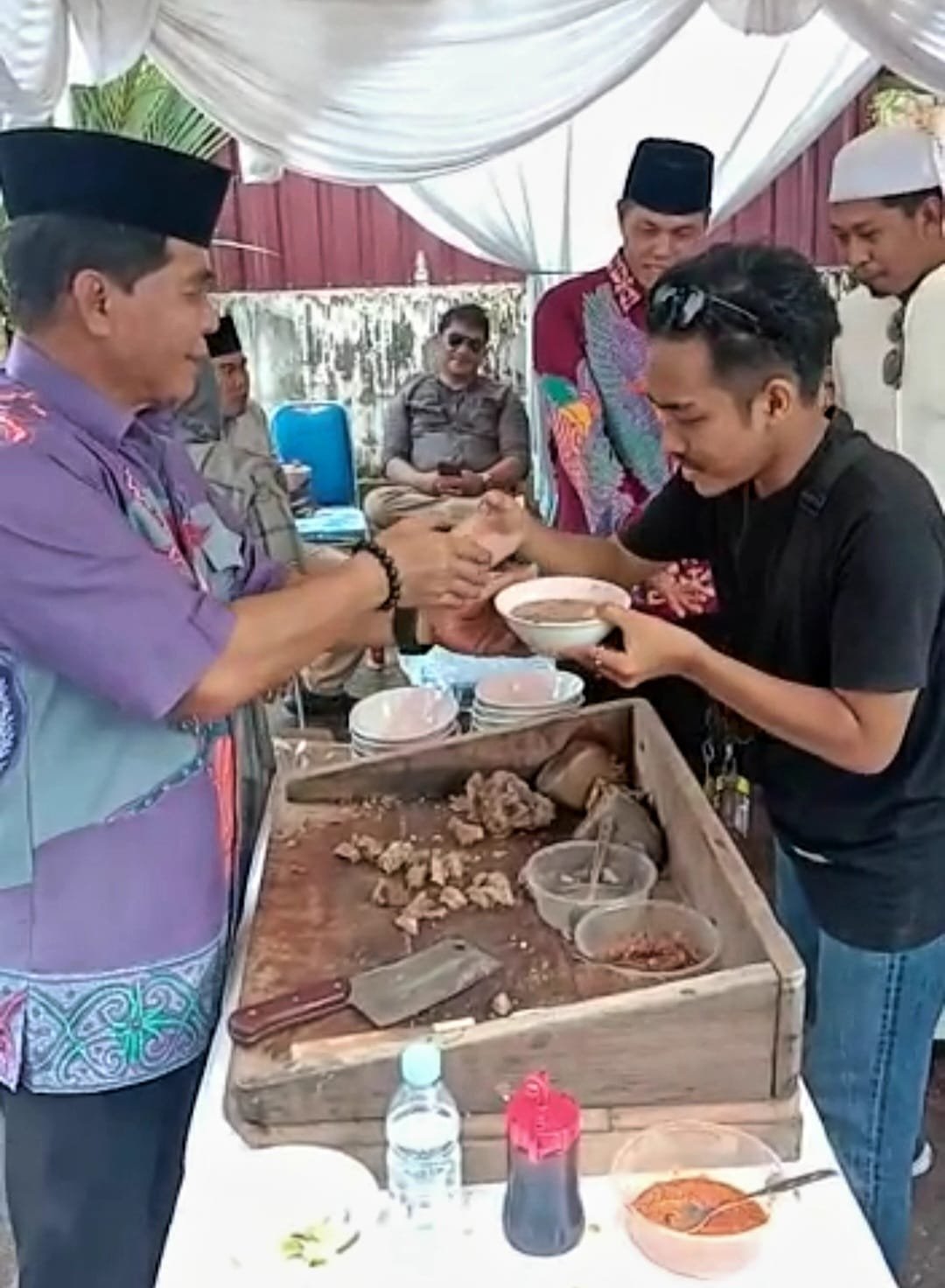 Usai meramu semangkuk Coto Makassar, mantan Wakapolda Kaltara ini lalu menyerahkan kepada tamunya yang sudah berdiri dihadapannya, lalu melanjutkan meracik mangkuk-mangkuk berikutnya buat melayani antrian panjang tamunya yang sangat ingin mencucipi kuliner andalan Kota Makassar tersebut.