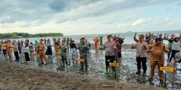 Kodim 1424 Sinjai dengan sejumlah pimpinan Forkopimda dan Pemerintah Kabupaten (Pemkab) Sinjai melakukan penanaman mangrove secara nasional di bibir pantai Dusun Batang, Desa Bua, Kecamatan Tellulimpoe, Kabupaten Sinjai, Senin (15/05/2023).