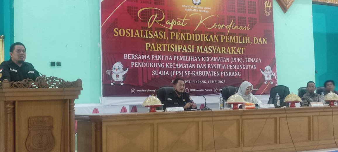 Rapat Koordinasi (Rakor) Sosialisasi, Pendidikan Pemilih dan Partisipasi Masyarakat yang diselenggarakan Komisi Pemilhan Umum (KPU) Kabupaten Pinrang di Aula Kantor Bupati Pinrang, Rabu (17/5/2023), menghadirkan peserta dari seluruh penyelenggara Badan Adhock yang ada di Pinrang, terdiri dari PPS, PPK dan Tenaga Pendukung Sekretariat PPK.