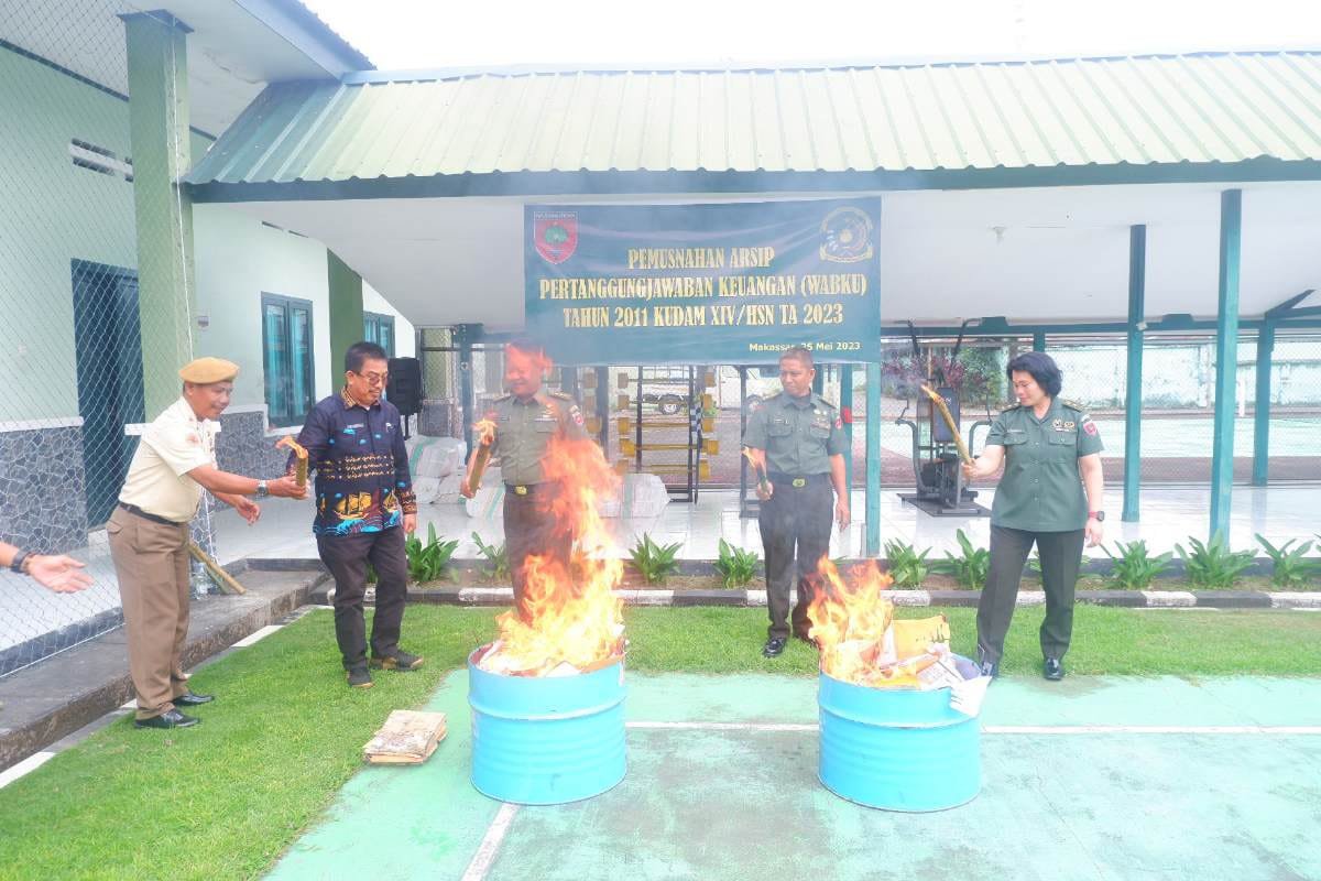 Keuangan Kodam (Kudam) XIV Hasanuddin (Hsn) kembali melakukan kegiatan Pemusnahan Arsip Pertanggung jawaban Keuangan (Wabku) tahun 2011, Kamis (25/5/2023) di Lapangan Kudam XIV Hasanuddin Jalan Cendrawasih Makassar.