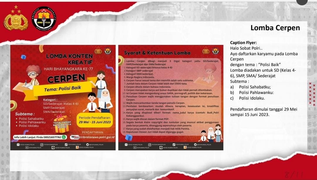 Lomba ini memperebutkan total hadiah ratusan juta rupiah. Pendaftaran dapat dilakukan di website : tribratanews.polri.go.id.