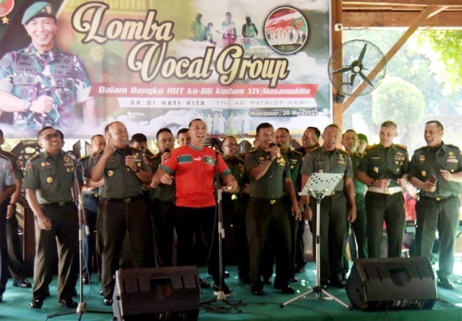 Menyambut Hari Ulang Tahun (HUT) ke-66 Kodam XIV/Hasanuddin (Hsn), Pangdam XIV/Hasanuddin Mayjen TNI Dr. Totok Imam Santoso, SIP, S.Sos, M.Tr(Han) didampingi Ketua Persit KCK PD XIV/Hasanuddin Ny. Desi Totok Imam, bersama sejumlah pejabat utama (PJU) Kodam dan pejabat TNI di wilayah Makassar, membuka Lomba Vocal Group antar Organisasi Wanita se-Sulsel, yang digelar di Baruga M. Yusuf Makodam, Selasa (30/05/2023).