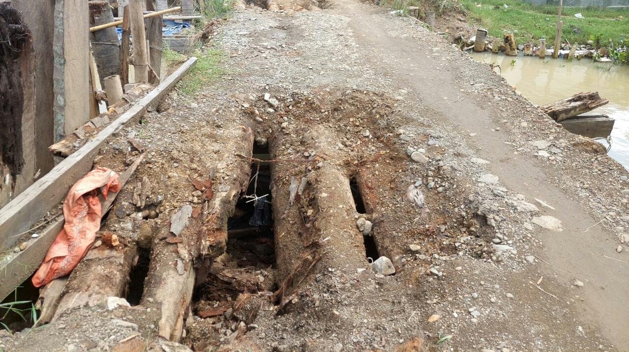 Akibatnya, jembatan darurat yang terbuat dari batang pohon kelapa menjadi patah dan lapuk sehingga tidak bisa dilalui oleh kendaraan roda empat.