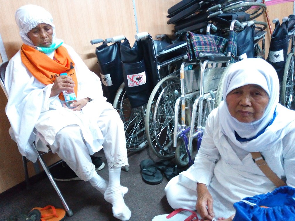 Tak lama kemudian sampailah saya di pintu Babussalam. Saya melihat dua orang nenek-nenek itu. Yang satunya duduk di lantai selonjoran sambil mengelus kaki. Seorang lainnya lagi berdiri menunggu datangnya kursi roda yang saya bawa.