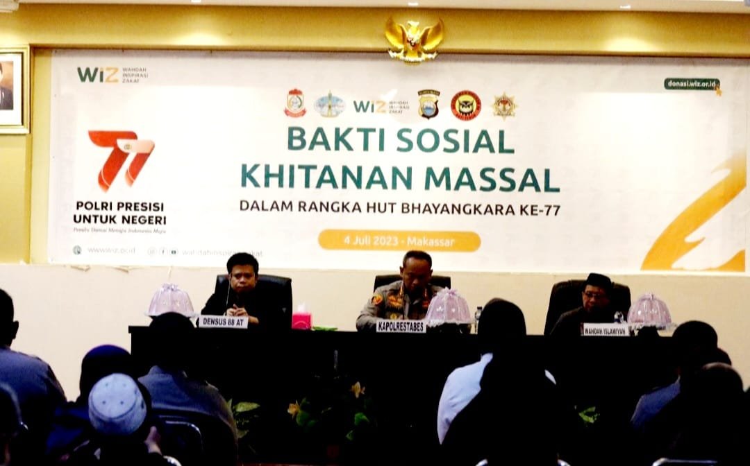 Densus 88 Anti Terror Mabes Polri bekerjasama dengan Polrestabes Makassar dan DPP Wahdah Islamiyah menyelenggarakan Bakti Sosial berupa khitanan massal, di Markas Polrestabes Makassar, Jalan Ahmad Yani No.9 Makassar, Selasa (4/7/2023).