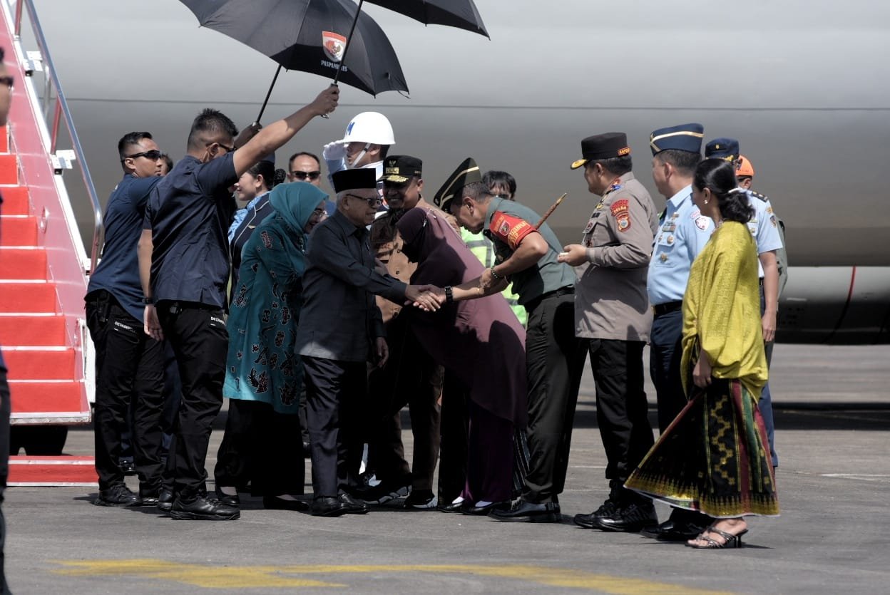 Tiba di Bandara, K.H. Ma’ruf Amin yang didampingi istri, Ibu Hj. Wury disambut bahagia oleh Pangdam XIV/Hasanuddin selaku Pangkogasgabpad Pam VVIP bersama Gubernur Sulsel Andi Sudirman Sulaiman, ST, Kapolda Sulsel Irjen Pol. Drs. Setyo Boedi Moempoeni Harso, SH, M. Hum beserta sejumlah pejabat utama (PJU) TNI dan Polri yang berada di wilayah Kota Makassar.