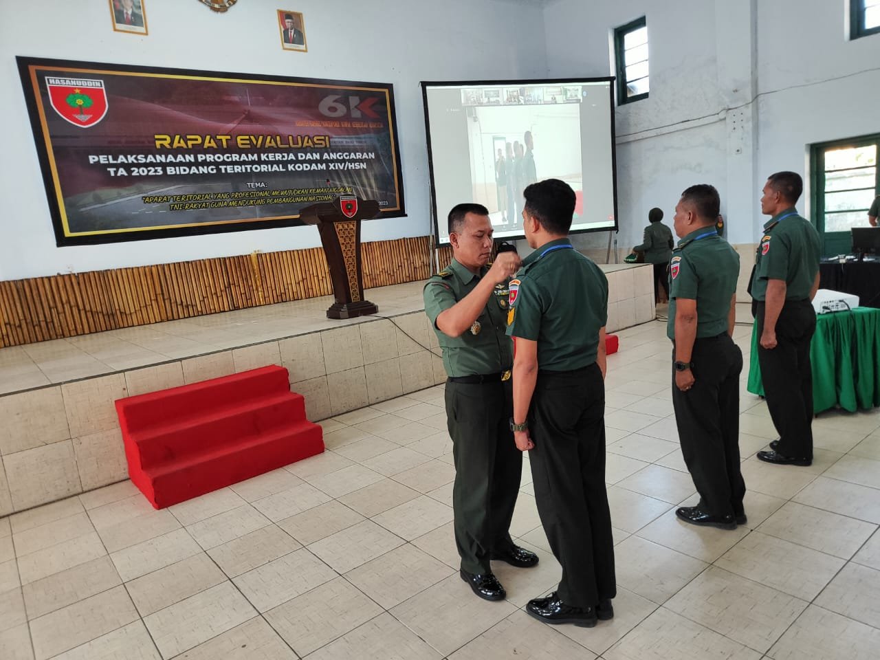 Aster (Asisten Teritorial) Kasdam XIV/Hsn Kolonel Inf Persada Alam memimpin rapat evaluasi Program Kerja dan Anggaran (Progjagar) Kodam XIV/Hasanuddin Semester I TA 2023 di Aula Makodim 1408/BS Makassar, Jumat (21/07/2023).