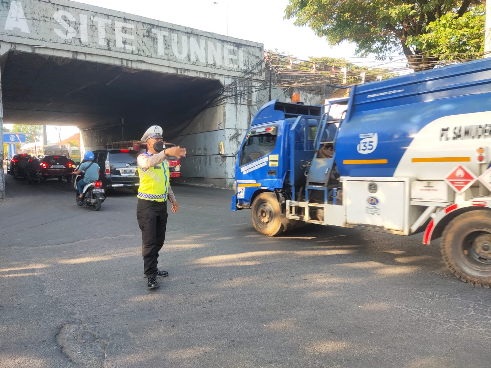 Unit Lantas Polsek Ujung Tanah jajaran Polres Pelabuhan Makassar melakukan pengaturan di jalan raya untuk mencegah kemacetan, Senin (07/08/2023).