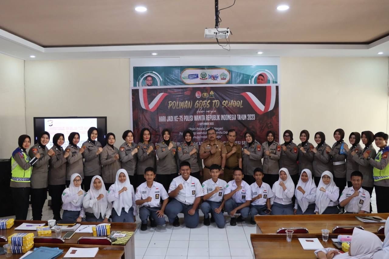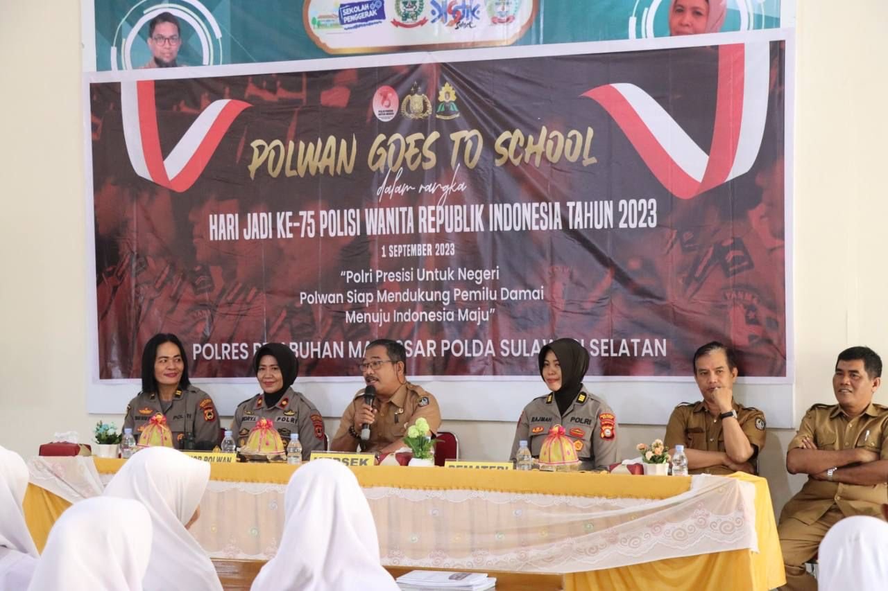 Satuan Polwan Polres Pelabuhan Makassar menggelar 'Polwan Goes to School' dengan konsep sosialisasi di SMA Negeri 4 Makassar jalan Cakalang kecamatan Ujung Tanah, Selasa (08/08/2023).