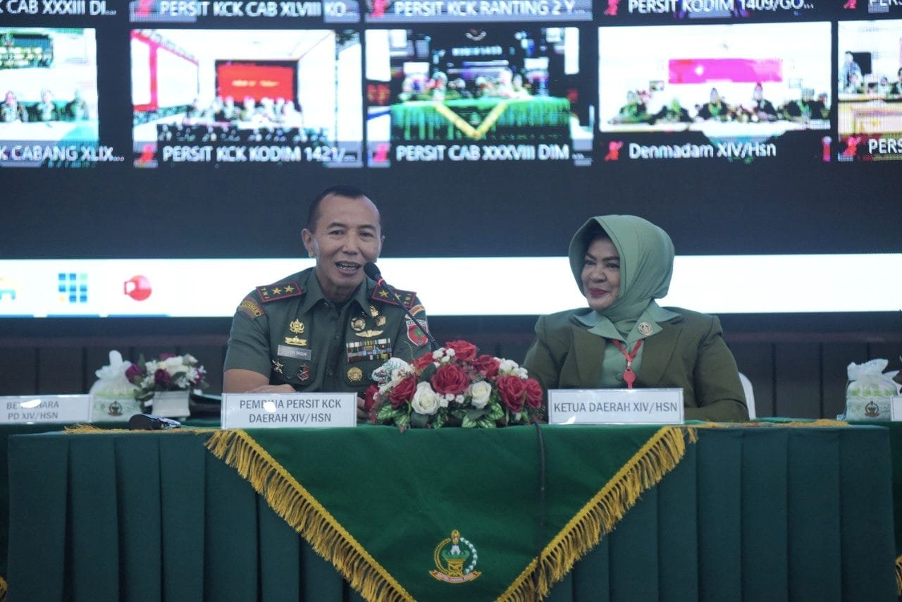 Pangdam XIV/Hasanuddin Mayjen TNI Dr. Totok Imam Santoso, SIP, S.Sos, M.Tr(Han) selaku Pembina Persit Kartika Chandra Kirana (KCK) PD XIV/Hasanuddin, didampingi Ketua Persit KCK PD XIV/Hasanuddin Ny. Desi Totok Imam, membuka Rapat Kerja Daerah (Rakerda), bertempat di Balai Prajurit Hasanuddin (BPH) Makodam, Kota Makassar, Selasa (8/08/2023).