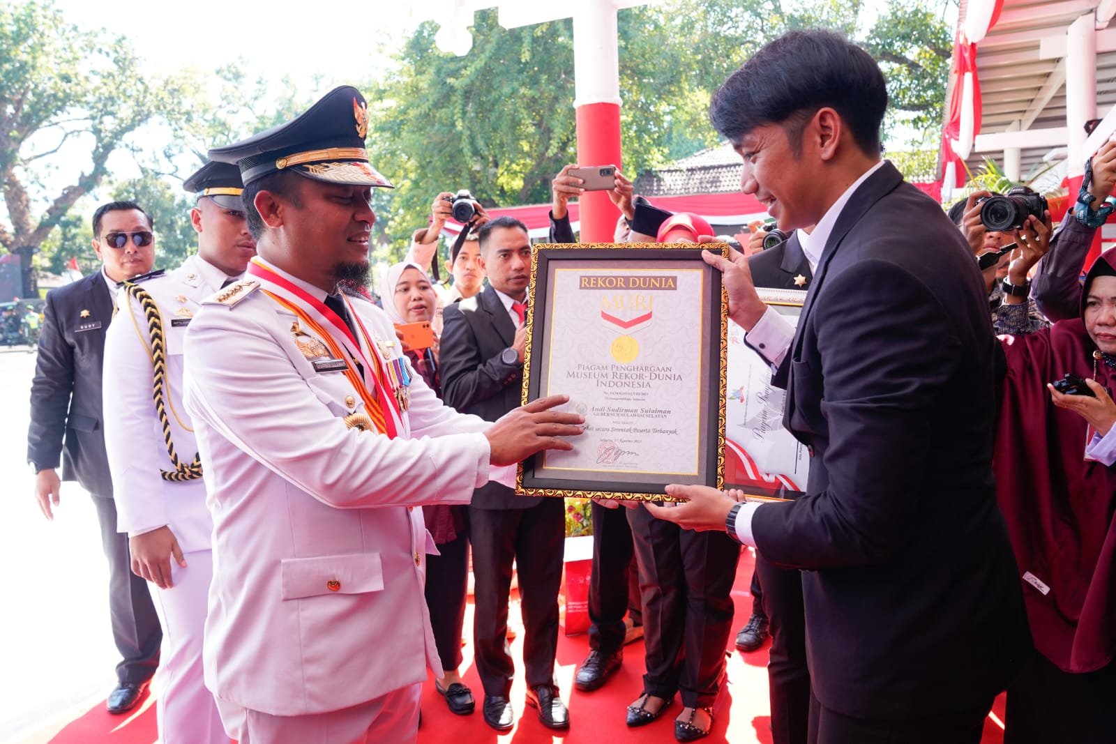 Gubernur Sulsel Andi Sudirman Sulaiman menerima penghargaan Rekor Dunia MURI atas rekor Jalan Sehat Secara Serentak Peserta Terbanyak Anti Mager dengan jumlah peserta 420.000 yang diserahkan di upacara 78 Tahun Kemerdekaan Republik Indonesia di Lapangan Rujab Gubernur Sulsel, Kamis, 17 Agustus 2023.