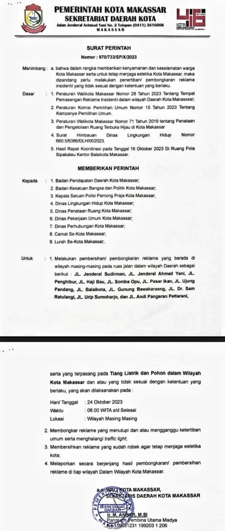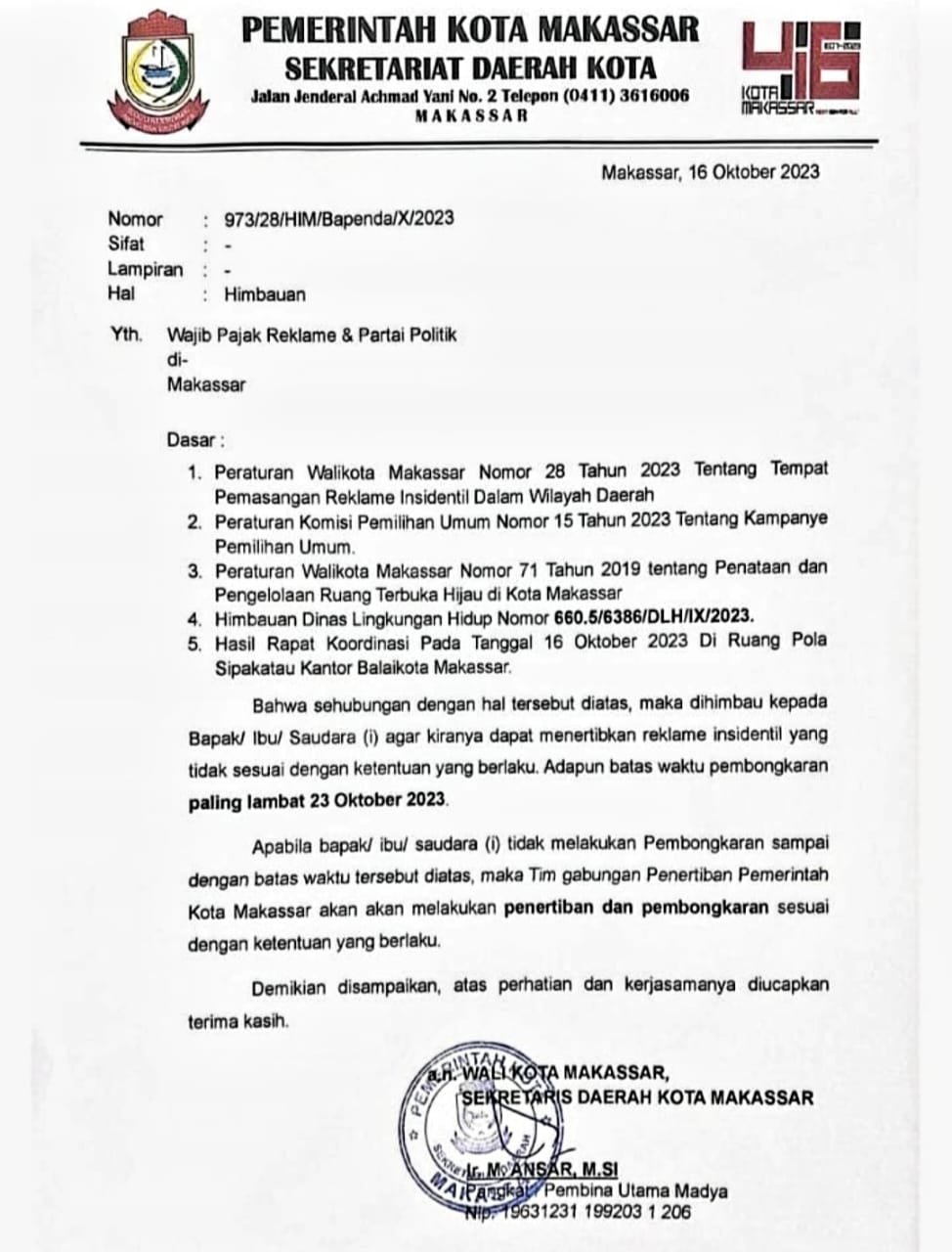 Pada Surat Imbauan itu, para partai politik diberi waktu paling lambat tanggal 23 Oktober 2023, dan dijadwalkan tanggal 24 Oktober 2023 aparat Pemerintah Kota Makassar akan turun menertibkan dan membongkar semua baliho, spanduk dan banner Caleg yang masih terpasang di jalan-jalan yang dilarang maupun tempat-tempat yang tidak dibolehkan.