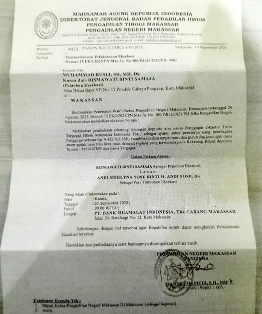 Secara terpisah, Humas PN Makassar, Wahyudi yang dikonfirmasikan Rabu (24/9/2025), membenarkan bahwa putusan perkara ini telah berkekuatan hukum tetap. Ia juga memastikan eksekusi dilaksanakan oleh pengadilan pada Kamis, 25 September 2025. (*)