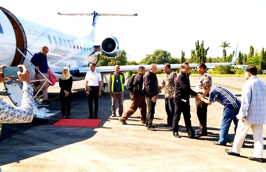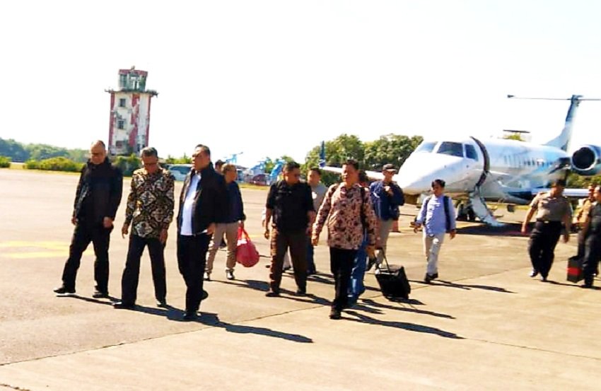 MenPAN-RB Syafruddin Kambo bersama 9 (sembilan) orang anggota rombongannya tersebut, datang dari Jakarta dengan menumpang pesawat non schedule milik PT Seacons Trading LTD nomor registrasi VP-CRC type Legacy 600 rute HLP-UPG yang dikemudikan pilot Capt Ronny Amiarsa.
