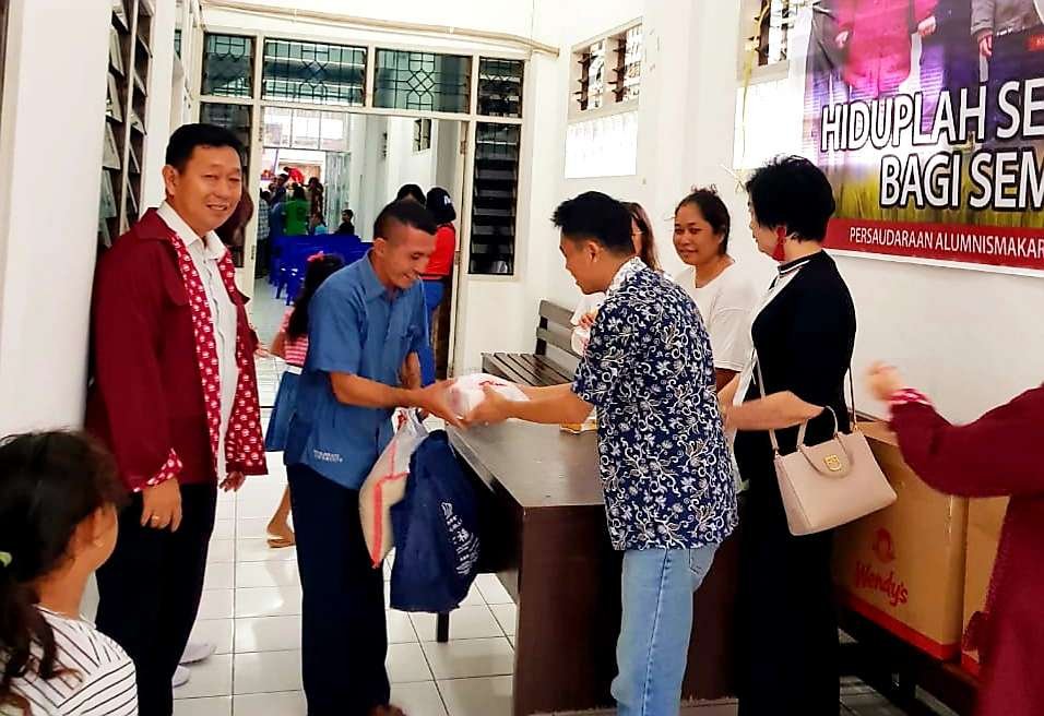Alumni lintas angkatan SMA Katolik Rajawali (Smakara) Makassar yang tergabung dalam Persaudaraan Alumni Smakara Wilayah Sulawesi Papua dan Maluku (PAS Supama) menggelar serangkaian kegiatan bakti sosial (baksos) berupa bagi-bagi ratusan paket makanan kepada masyarakat di sejumlah lokasi Kota Makassar, Kamis (12/12/2019).