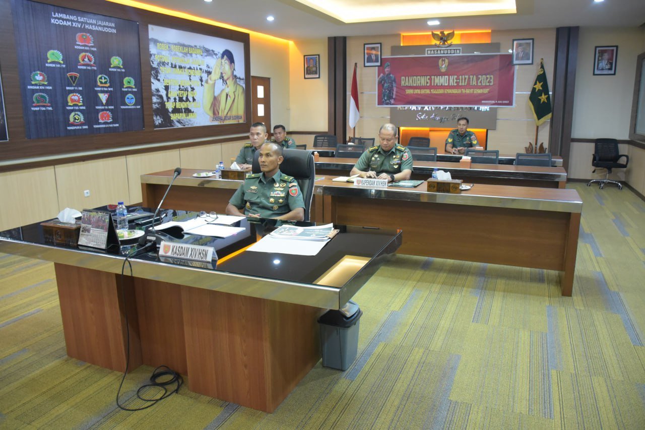 Kasdam XIV/Hasanuddin Brigjen TNI Mohammad Syech Ismed, SE, M.Han mewakili Pangdam XIV/Hasanuddin bersama Aster Kasdam dan Kapendam XIV/Hasanuddin, mengikuti Rapat Koordinasi Teknis (Rakornis) Tentara Manunggal Membangun Desa (TMMD) Ke-117 TA 2023 secara virtual yang dipimpin langsung oleh Asisten Teritorial (Aster) Kasad Mayjen TNI Mochammad Hasan, bertempat di Ruang Puskodalops Makodam, Kota Makassar, Selasa (4/07/2023).