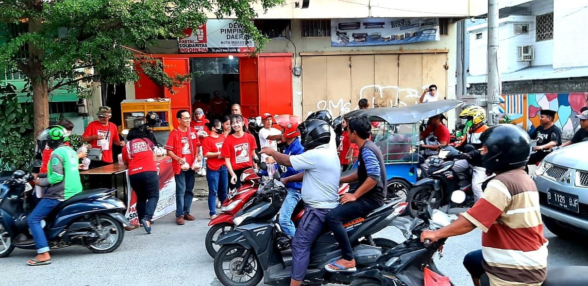 Bertujuan untuk melatih semangat dan motivasi saling berbagi kepada sesama serta mengharapkan keberkahan di bulan Ramadan ini, DPD Partai Solidaritas Indonesia (PSI) Kota Makassar menggelar kegiatan bagi-bagi takjil (penganan buka puasa) kepada masyarakat pengguna jalan, Jumat (14/04/2023) sore.