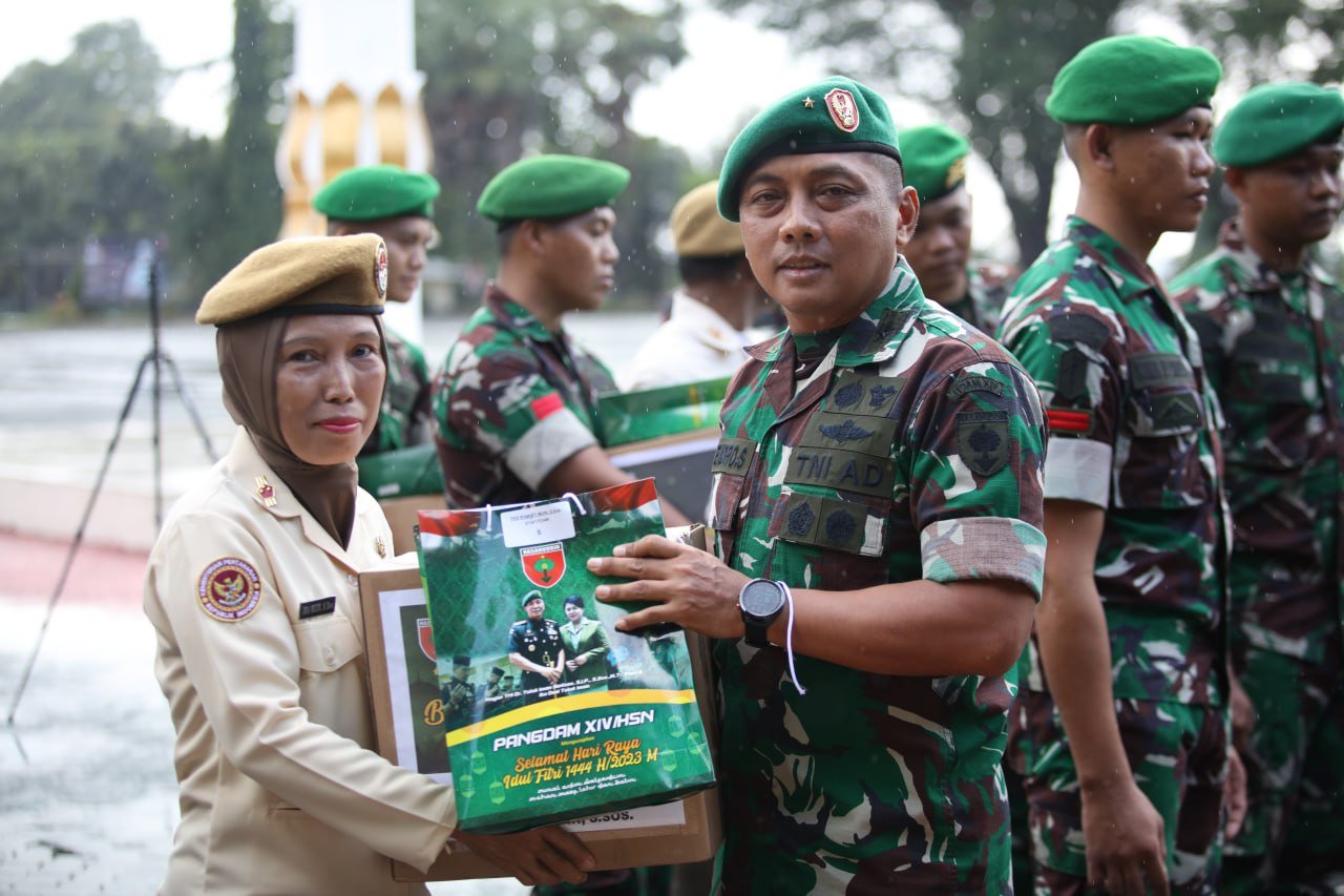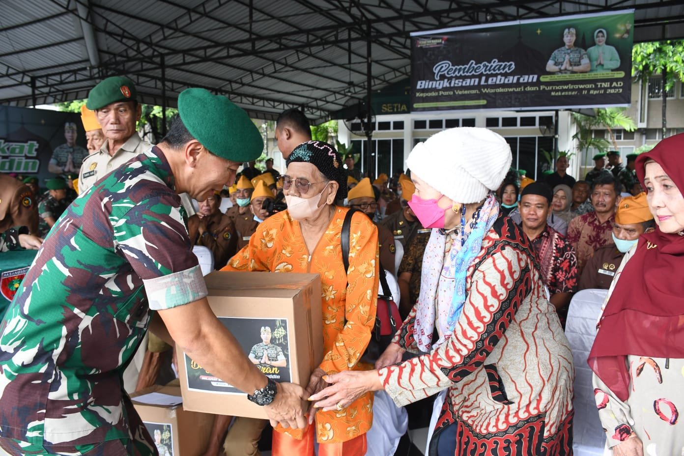 Menyambut perayaan Hari Raya Idul Fitri 1444 H, Pangdam XIV/Hasanuddin Mayjen TNI Dr. Totok Imam Santoso, SIP, S.Sos, M.Tr.(Han) menyerahkan bingkisan lebaran kepada para Purnawirawan, Veteran, dan Warakawuri, berlokasi di Lapangan M. Yusuf Makodam, Kota Makassar, Selasa (11/04/2023).