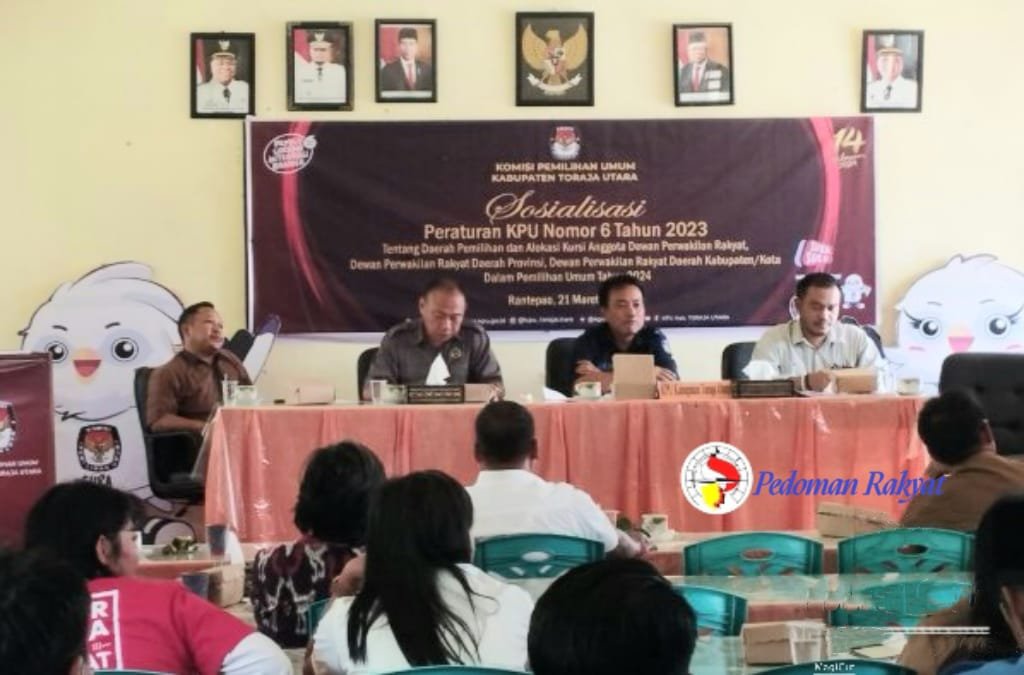 Komisi Pemilihan Umum (KPU) Kabupaten Toraja Utara melakukan sosialisasi hasil penetapan Daerah Pemilihan (Dapil) dan Alokasi Kursi Anggota DPRD Kabupaten Toraja Utara tahun 2024. Dalam Sosialisasi, KPU menetapkan 6 Dapil dengan 30 kursi anggota DPRD di Toraja Utara.