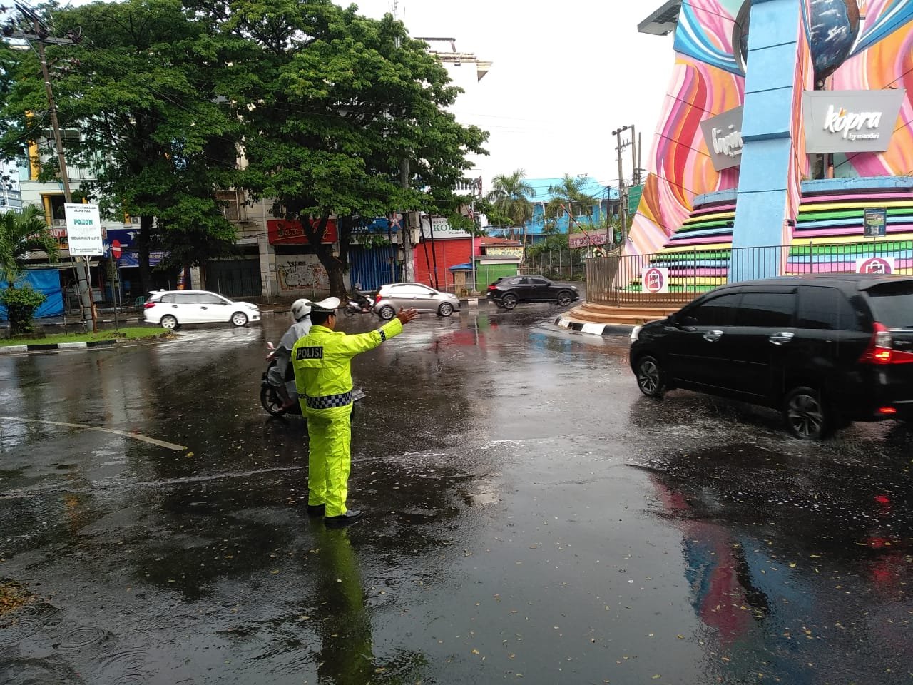 Di tengah hujan yang mengguyur Makassar, Satuan Lalu Lintas Polres Pelabuhan Makassar tetap menjalankan tugas. Tak peduli diguyur hujan, para personel polisi tetap bekerja mengatur lalu lintas.