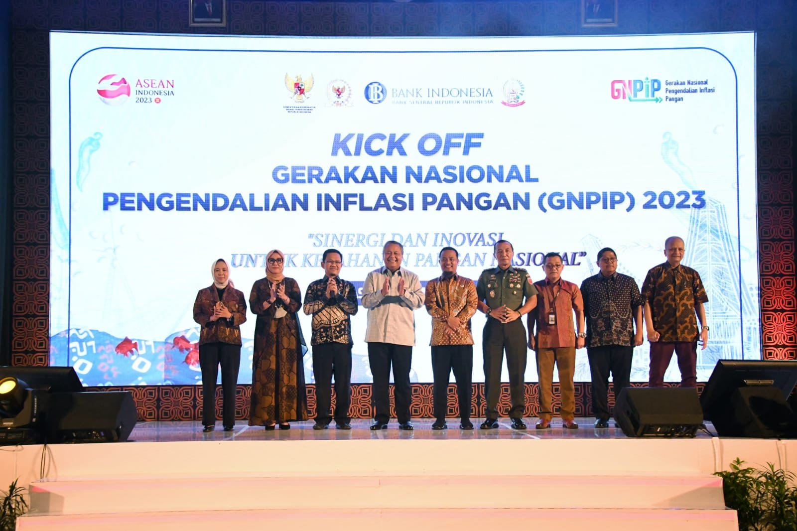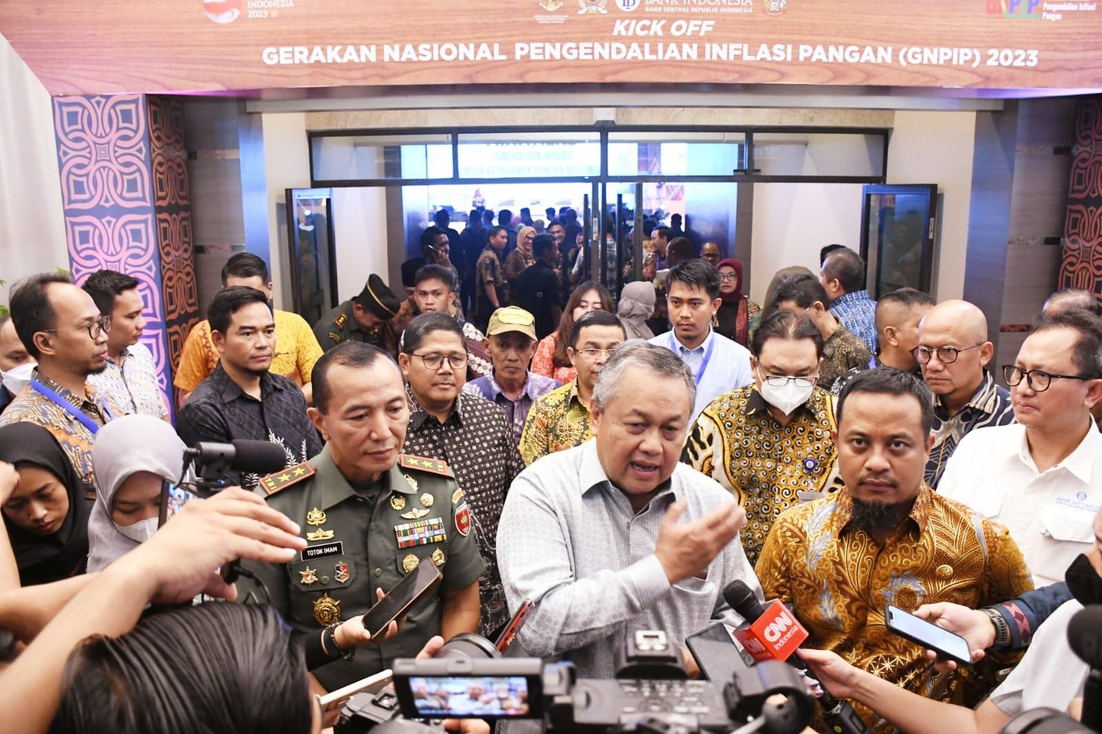 Pangdam XIV/Hasanuddin Mayjen TNI Dr. Totok Imam Santoso, SIP, S.Sos, M.Tr(Han) mengikuti Kick Off Gerakan Nasional Pengendalian Inflasi Pangan (GNPIP) 2023, yang digaungkan oleh Bank Indonesia (BI), dengan mengusung tema “Sinergi dan Inovasi Untuk Ketahanan Pangan Nasional”, bertempat di Balai M. Yusuf, Kota Makassar, Minggu (05/03/2023).