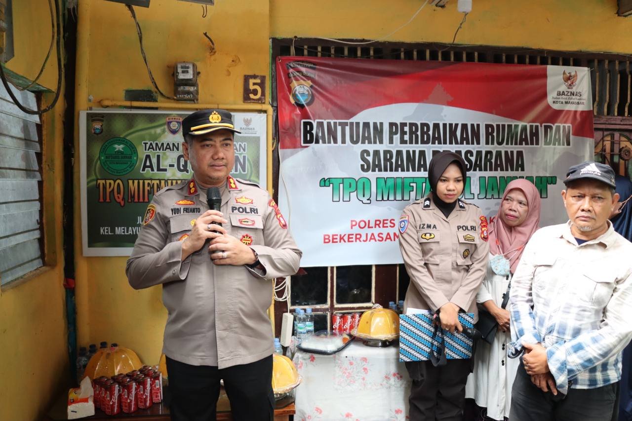 Kapolres Pelabuhan Makassar AKBP Yudi Frianto, SIK, MH melakukan peletakan batu pertama pembangunan Rumah Tahfiz Al-Qur'an TPQ Miftahul Jannah yang bekerjasama dengan Baznas Makassar, Jumat (23/09/2022).