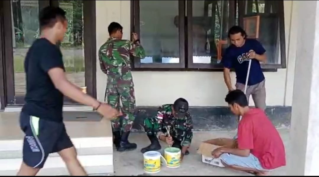 Personel Pos Sei Tengah Satgas Pamtas RI-MLY Yonif 645/Gty dipimpin Serda Efrin beserta 5 (lima) orang anggota bahu membahu bersama warga masyarakat melaksanakan kegiatan Karya Bakti melakukan pengecatan Mushola Darul Iman, Dusun Sungai Tengah, Kecamatan Paloh, Kabupaten Sambas, Provinsi Kalimantan Barat.