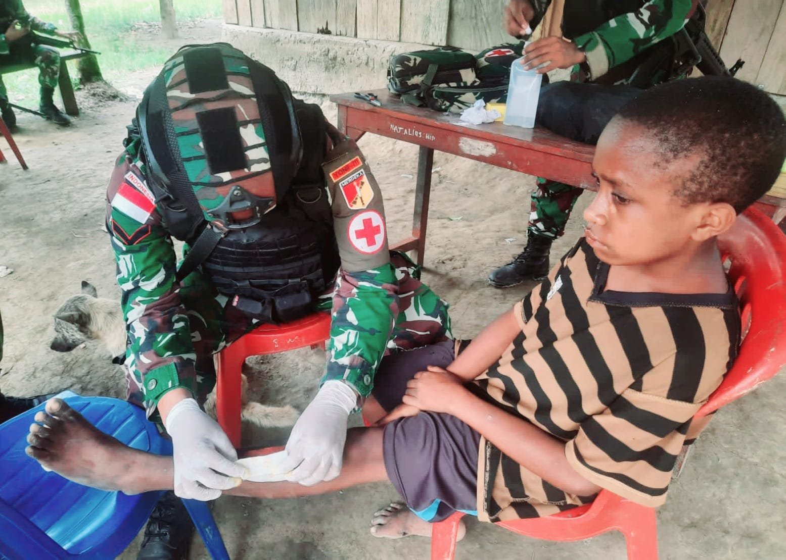 Dalam memberikan pelayanan kesehatan kepada masyarakat di wilayah Papua, tim kesehatan Satgas Pamtas RI-PNG Yonif 711/Rks Brigif 22/OM melalui Pos Ampas gerak cepat bantu mengobati anak-anak yang sedang terluka di Kampung Ampas, Distrik Arso Timur, Kabupaten Keerom, Papua, Sabtu (17/09/2022).