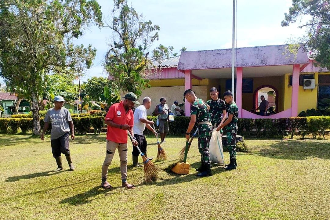 Guna menciptakan lingkungan bersih, nyaman dan indah di wilayah Papua, Satgas Pamtas RI-PNG Yonif 711/Rks Brigif 22/OM Pos Arso Tami melaksanakan karya bakti pembersihan halaman kantor kebun Arso di Kampung Arso Tami, Distrik Arso Timur, Kabupaten Keerom, Papua, Kamis (08/09/2022).