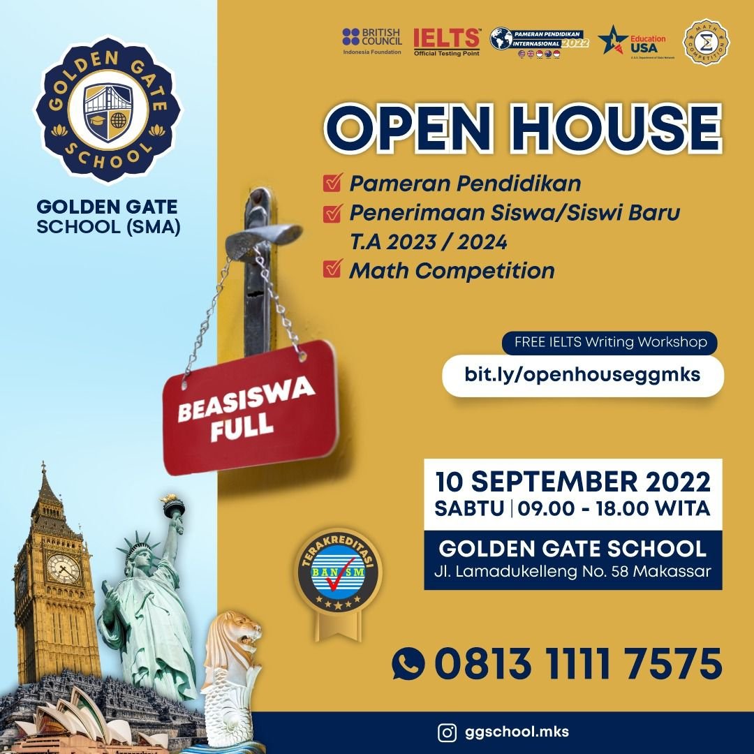 Golden Gate School (GGS) Makassar akan mengadakan kegiatan Open House dalam rangka memperingati hari jadi sekolah, Sabtu (10/09/2022).