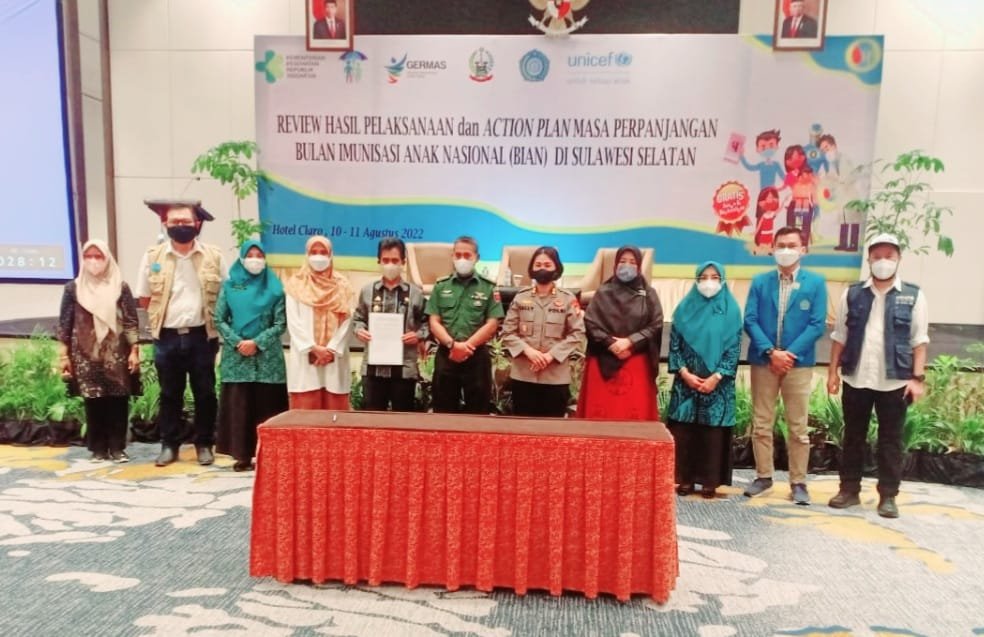Wakil Bupati Kepulauan Selayar Saiful Arif mewakili unsur Pemerintah Kabupaten/Kota se-Sulawesi Selatan turut menandatangani Deklarasi atau Kesepakatan Bersama segenap stakeholders, Kamis (11/08/2022) siang di Hotel Claro, Makassar, untuk mencapai target nasional minimal 95 persen dalam pelaksanaan Bulan Imunisasi Anak Nasional (BIAN) tingkat Provinsi Sulawesi Selatan.