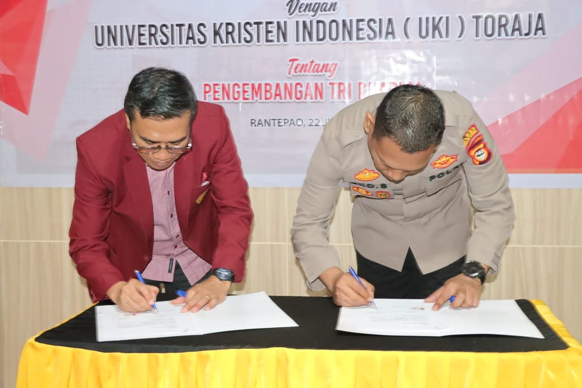 Univeristas Kristen Indonesia (UKI) Toraja menjalin kerjasama dengan Polres Toraja Utara dengan ditandai penandatanganan Nota Kesepahaman (MoU) oleh Rektor UKI Toraja Dr. Oktavianus Pasoloran, dan Kapolres Toraja Utara AKBP Eko Suroso, di Mapolres Toraja Utara, Rabu (22/06/2022).