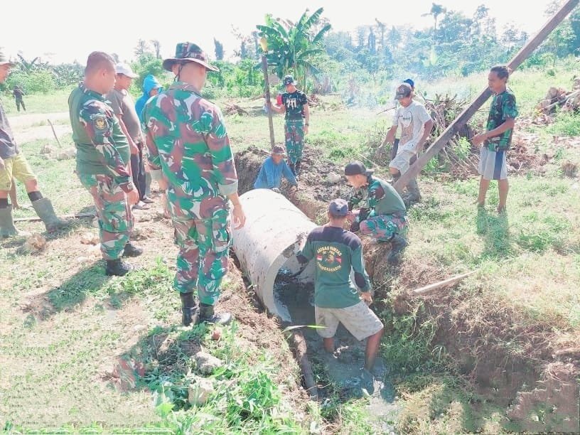 Terwujudnya kemanunggalan TNI dengan rakyat, Satgas Pamtas RI-PNG Yonif 711/Rks Pos Yamara melaksanakan karya bakti bersama masyarakat membangun jembatan jalan ke kebun warga di Kampung Yanemyo, Distrik Arso Timur, Kabupaten Keerom, Papua, Selasa (21/06/2022).