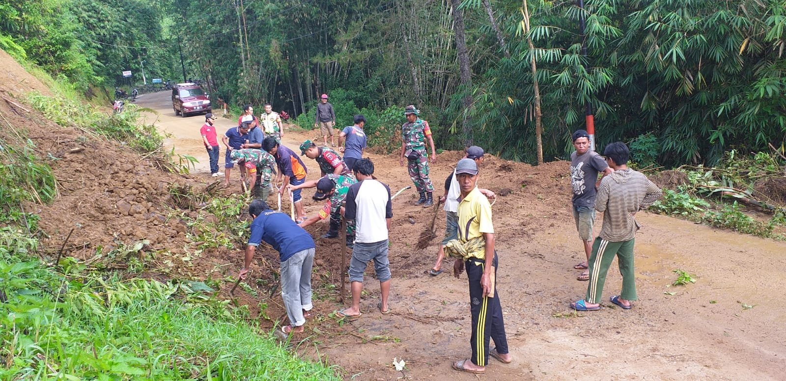 Tentara Nasional Indonesia (TNI) bersama warga bergotong royong untuk membuka akses jalan yang sempat tertutup akibat tanah longsor.