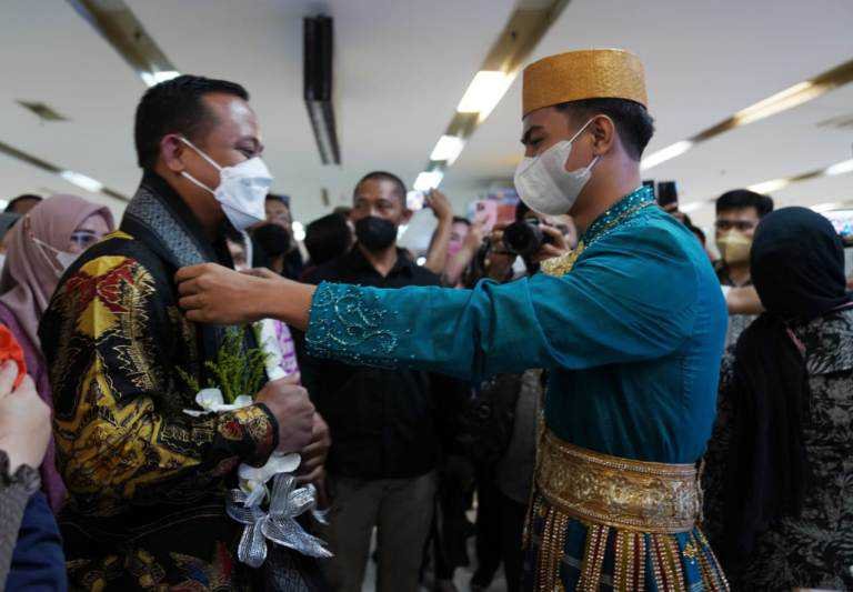 Masyarakat Sulawesi Selatan menyambut kedatangan Gubernur Sulawesi Selatan Andi Sudirman Sulaiman di Bandara Internasional Sultan Hasanuddin, Makassar, Sabtu (12/3/2022).
