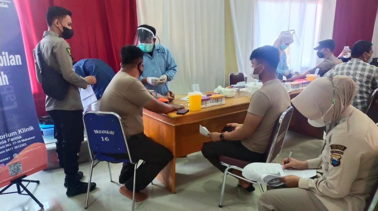 Seluruh personel Polres Luwu Utara (Lutra) Polda Sulawesi Selatan (Sulsel) periksa kesehatan berkala yang diadakan Biddokes Polda Sulsel kerjasama dengan Paur Kes Polres Luwu Utara di Aula Sarja Arya Racana Polres Lutra, Kamis 24 Februari 2022.