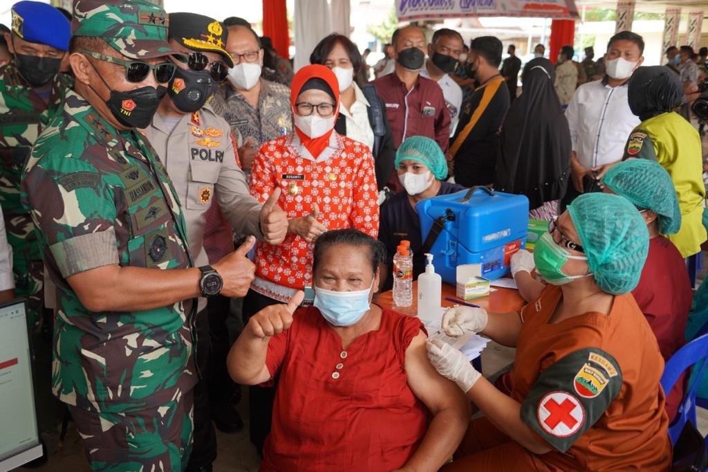 Usai melaksanakan vidcon dengan Kapolri Jenderal Polisi Drs. Listyo Sigit Prabowo, M.Si, Pangdam I/Bukit Barisan (BB) Mayjen TNI Hassanudin, SIP, MM bersama Kapolda Sumut Irjen. Pol. Drs. R.Z. Panca Putra Simanjuntak, M.Si melanjutkan kegiatannya meninjau vaksinasi terhadap lansia di Lapangan H Adam Malik Pematang Siantar, Kamis (24/02/2022).