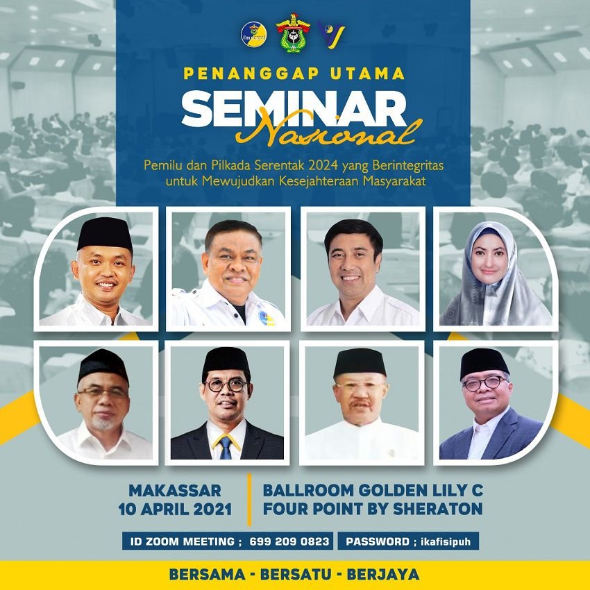 Pada tanggal 10 April 2021 mendatang, Panitia Musyawarah besar (MUBES) VI Ikatan Keluarga Alumni (IKA) Fakultas Ilmu Sosial dan Ilmu politik (FISIP) Universitas Hasanuddin (UNHAS) akan menyelenggarakan Seminar Nasional dengan menghadirkan 5 Bupati, 2 Wakil Bupati dan 1 Sekda Provinsi sebagai penanggap pada Seminar Nasional dengan tema "“Pemilu dan Pilkada Serentak 2024 yang Berintegritas untuk Mewujudkan Kesejahteraan Masyarakat”, di Ballroom Golden Lily C, Four Point by Sheraton Makassar, dengan kombinasi luring dan daring.