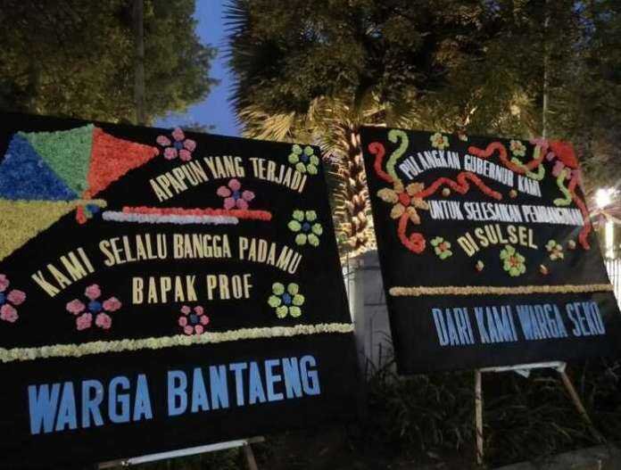 Rumah jabatan Gubernur Sulawesi Selatan di Jalan Jenderal Sudirman, Kota Makassar, Rabu (3/3/2021), dipenuhi karangan bunga.