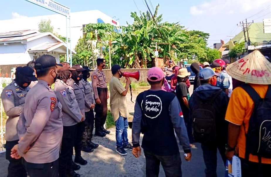Personel Polres Gowa melaksanakan pengamanan aksi unjuk rasa oleh Aliansi Kelompok Tani Berutallasa’ bertempat di depan Kantor Dinas Pertanian Kabupaten Gowa, Senin (16/11/2020).