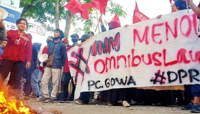 Gerakan tolak Omnibus Law UU Cipta Kerja di Makassar pada Kamis (08/10/2020) diwarnai kericuhan dan aksi lempar batu antara polisi dan massa demo. Hal ini lantaran tidak adanya anggota DPRD Sulawesi Selatan yang menemui atau mendengarkan aspirasi mereka.
