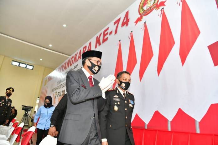 Gubernur Sulawesi Selatan (Sulsel), Prof. HM Nurdin Abdullah, menghadiri peringatan Hari Ulang Tahun (HUT) ke-74 Bhayangkara di Polda Sulsel, Rabu (1/7/2020).