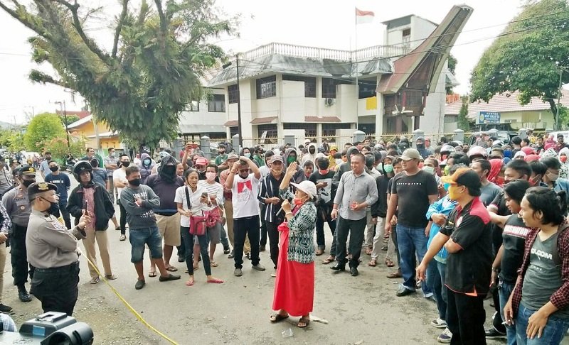Ratusan massa yang tergabung dalam Aliansi Masyarakat Peduli Keadilan (AMPK) Toraja Utara bersama keluarga korban penganiayaan Arnold Hutasoid (Anno) yang didampingi tim pengacaranya mendatangi kantor Polres Toraja Utara dan menggelar aksi demo, Senin (22/06/2020).